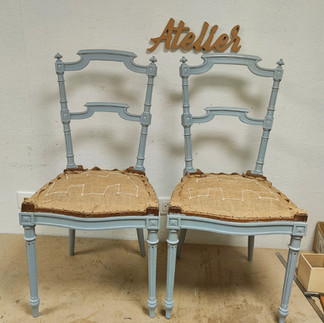 Une jolie rénovation traditionnelle en crin pour ces deux petites chaises de style directoire . Magnifiées par le tissu Betta de chez Casamance.